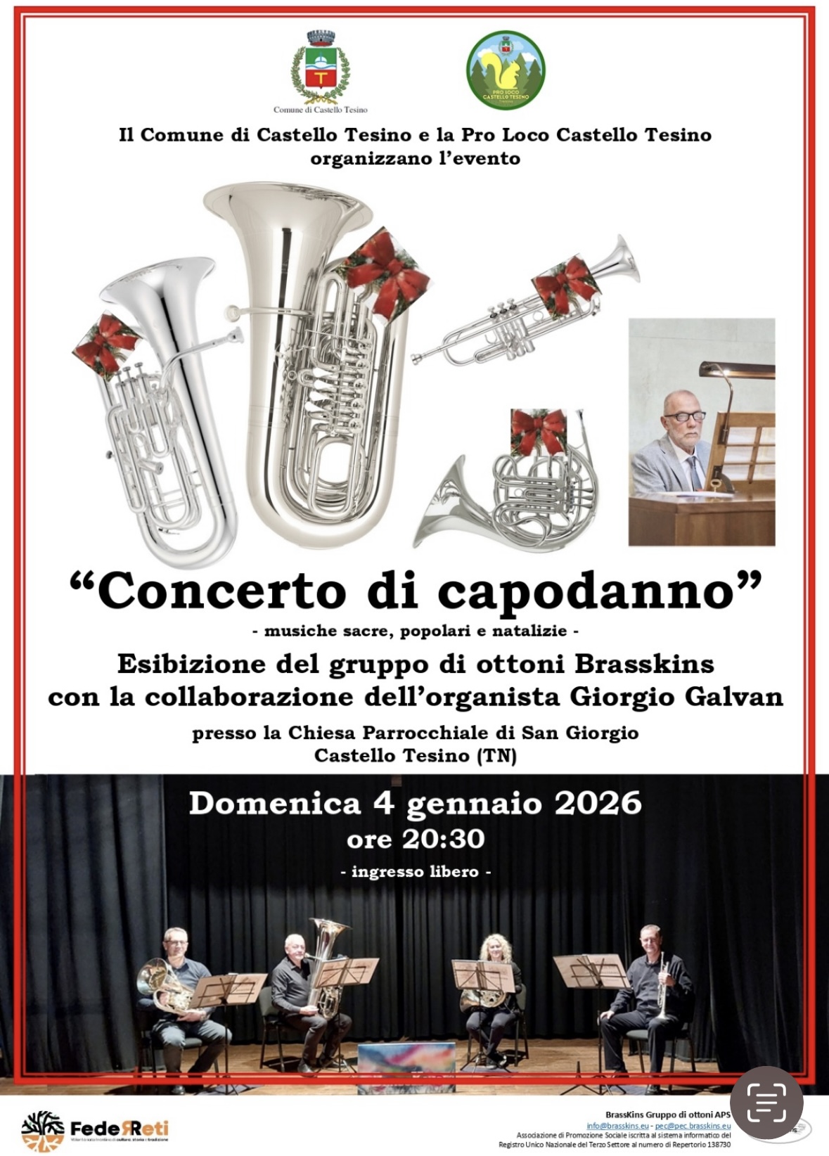 Presso la chiesa San Giorgio di Castello Tesino concerto di musiche sacre, popolari e natalizie con il gruppo di ottoni "Brasskins" accompagnati dall'organista Giorgio Galvan.