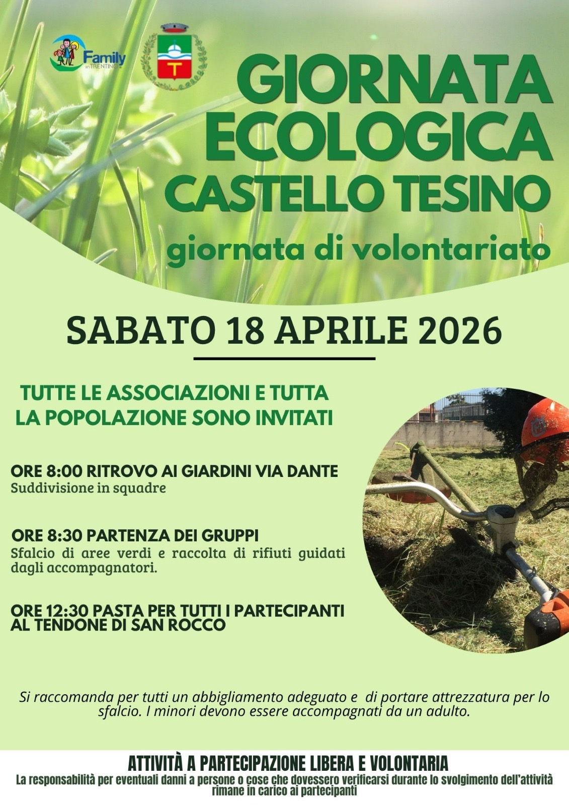 GIORNATA ECOLOGICA CASTELLO TESINO. Giornata di volontariato dedicata alla cura del territorio.Sabato 18 aprile 2026 con ritrovo alle ore 8:00 ai Giardini (Via Dante)Inizio attività ore 8:30 (pulizia e sfalcio aree verdi)Ore 12:30 pasta per tutti al tendone di San Rocco.